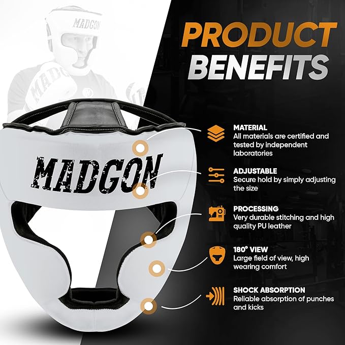 MAKSİMUM GÜVENLİK İÇİN EN İYİ KAFA KORUMASI: Kask, darbelerden veya tekmelere karşı yüksek darbe ve şok emilimi için ideal dolguya sahiptir. Kolay kapatma sistemimiz takmayı ve çıkarmayı çok daha kolay hale getirir, Velcro tutturucuyu biraz gerginlikle kapatın ve baş koruyucusu başınıza mükemmel uyum sağlar. Optimum koruma için MADGON ekipmanınız – tamamen güvende hissedersiniz ve güvenle savaşa girebilirsiniz.