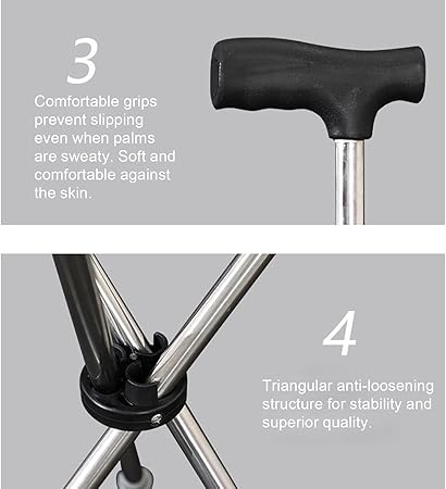 Pürüzsüz oturma geçişleri: kayma önleyici kauçuk ayaklar ve üç ayaklı bir taban ile donatılmış bu yürüyüş bastonu, düzgün oturma geçişlerini kolaylaştırırken eşit olmayan arazide bile güvenli ve istikrarlı bir yardım sağlar.