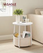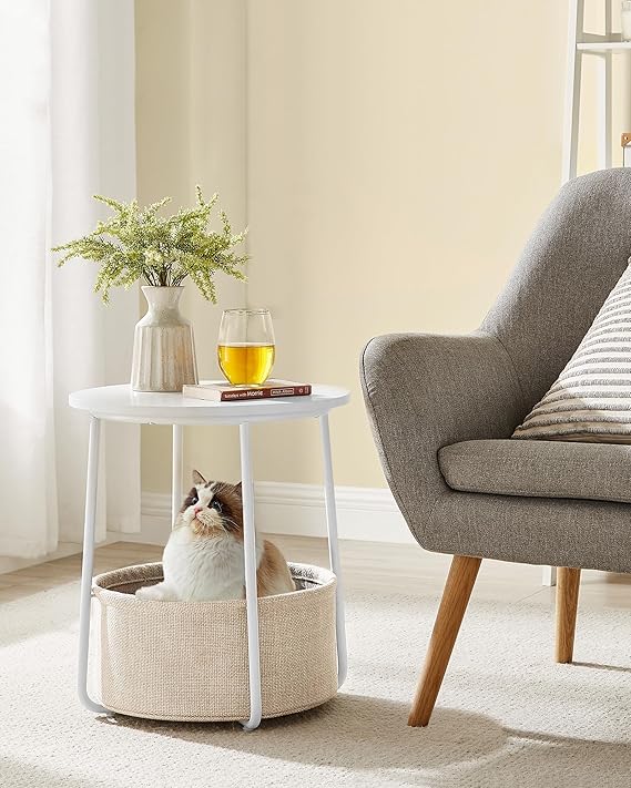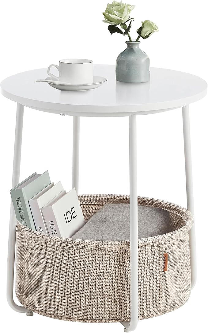 Yuvarlak sehpa, küçük masa, sehpa küçük, kumaş sepetli oturma odası masası, oturma odası, yatak odası için depolama alanı, modern komodin, beyaz-bej LET223W10