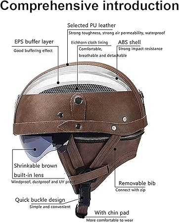 Yüz Kask Motosiklet Kaskı Erkek Kadın Deri Kask Yarım Kask Scooter Kask Cruiser Chopper Pilot Jet Kask Crash Kask DOT ECE Onaylı(G,M=(57~58cm))