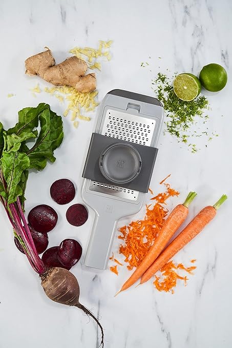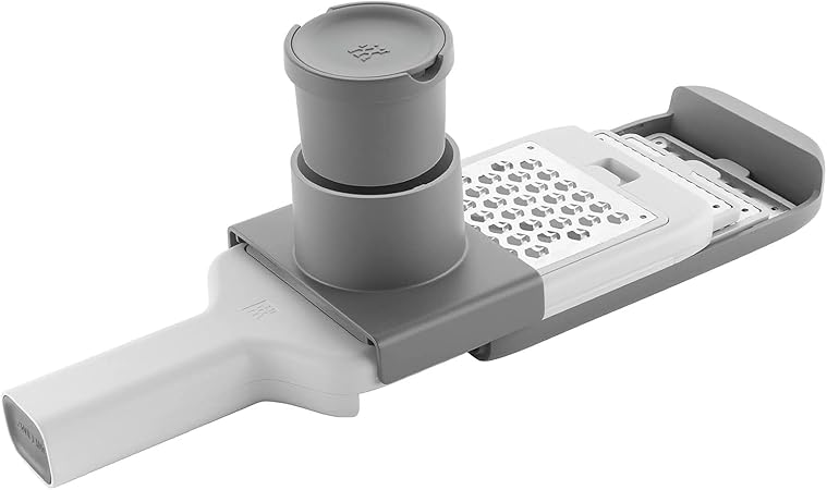 Z-Cut çoklu rende, çok fonksiyonlu, paslanmaz çelik, 4 değiştirilebilir bıçak ucu, iki yönlü sürtünme teknolojisi, entegre toplama tepsisi, gri