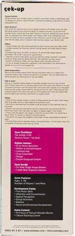 Menşe Ülke: Türkiye 3-99 yaş 2 kişinin oynayabildiği eğlenceli bir oyundur El ve motor becerileri, Dikkat ve Konsantrasyon, Uzaysal Algı, Grup çalışmaları, Denge becerilerini geliştirir 54 adet 7×2,3×1,5 cm doğal ahşap bloklar, 1 adet blok organize kartonu