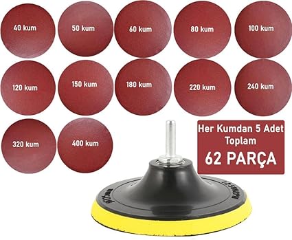 ☑️62 Parça Set: 5’er adet 40, 50, 60, 80, 100, 120, 150, 180, 220, 240, 320 ve 400 kum diskleri ile tam donanımlı bir zımpara deneyimi sunar.